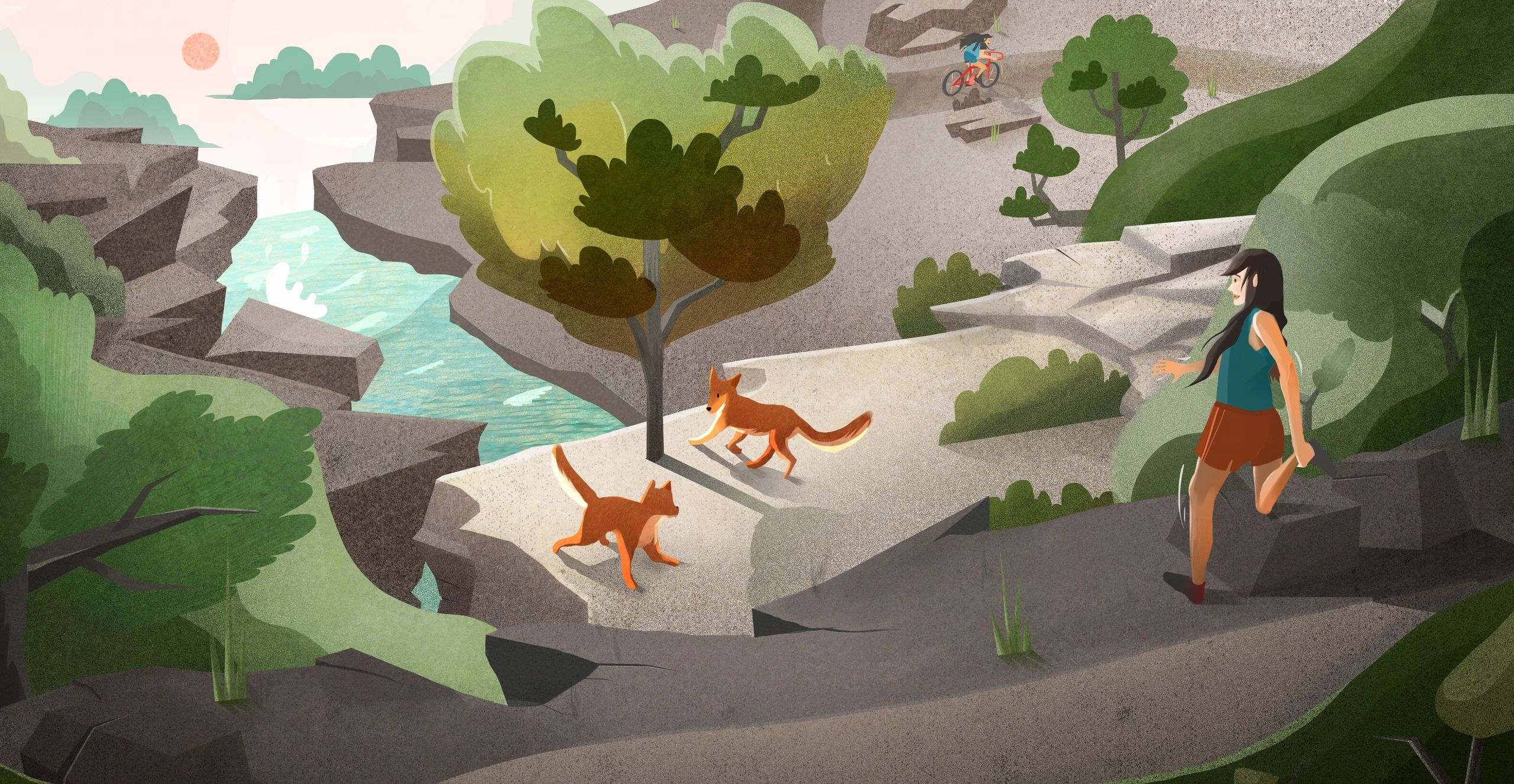 I met Timo when we were both attending a small group for international students in Pittsburgh. I told him I was planning to publish a poetry collection, and he immediately agreed to collaborate with an illustration. When I sent him the poem "Two Foxes" below, he designed the image that I eventually decided would become the cover for my chapbook. The variety of green and teal colors he chose and the centering of the natural landscape perfectly capture the observing eye and the meditative space that I hope my poetry will communicate and continue to help create.